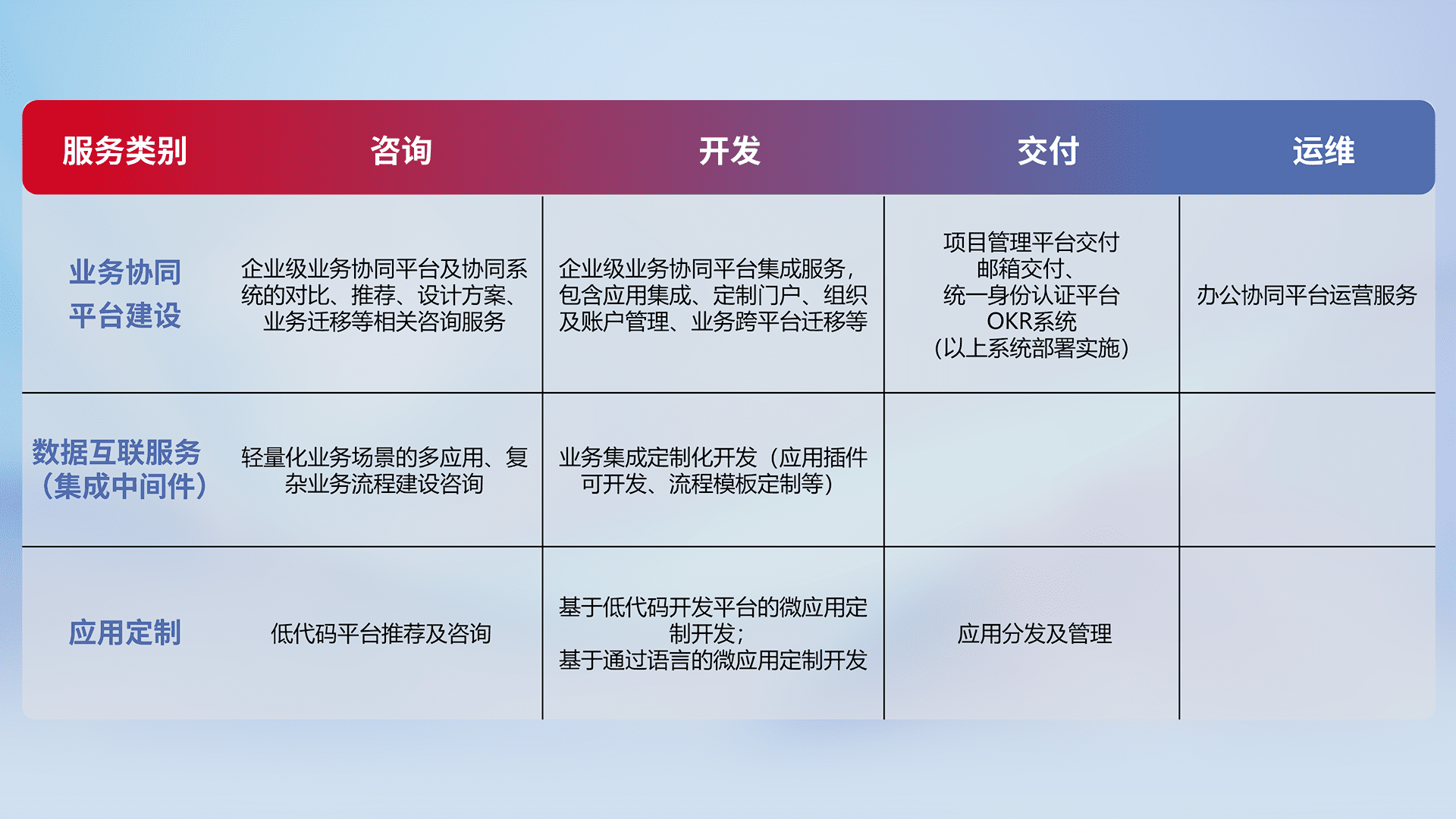 针对钉钉、、企微、、、、IDaas等平台级产品提供产品的规划、、、方案、、、交付、、定制化开发等服务,,实现如统一协同办公、、智能客户服务、、混合会议管理、、智能数据查询、、、等业务场景,,,实现数字化转型。。